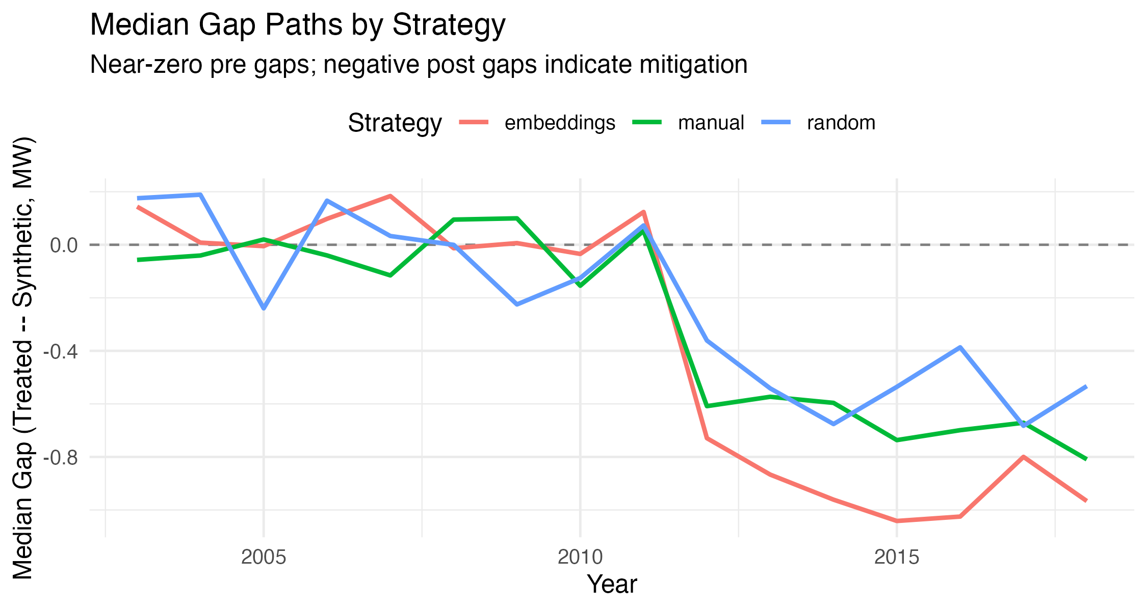 Interpretation: All strategies show near-flat pre-trends (flat gray band 2003–2011), supporting the assumption that treated and control outcomes would have followed parallel paths absent treatment. Post-2012, Embeddings (green) exhibits the largest and most stable negative gap, approximately twice the magnitude of Manual and Random strategies. The absence of systematic pre-existing divergence strengthens causal attribution.