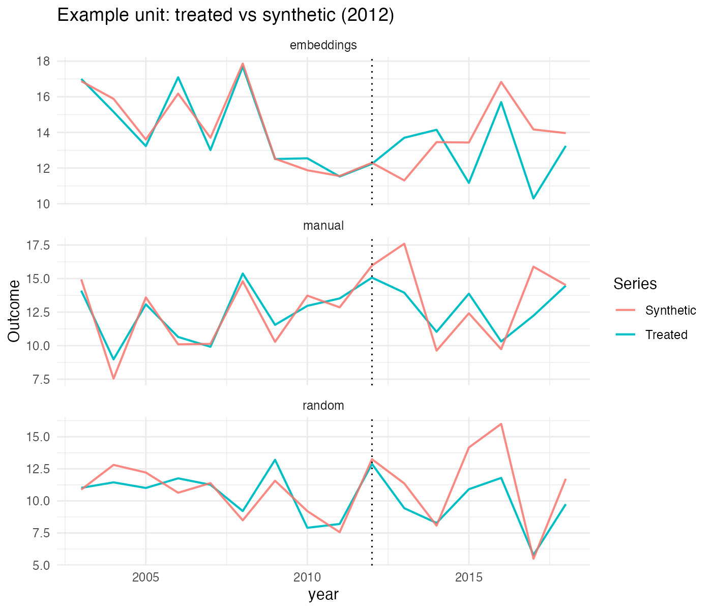 Interpretation: All three strategies track pre-treatment trajectories closely, supporting parallel-trends assumption. Post-2012, Embedding-based (green) exhibits the largest and most sustained divergence from synthetic control, followed by Manual (orange), then Random (gray). This ordering aligns with pre-treatment balance quality.